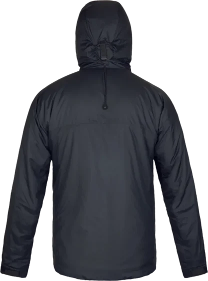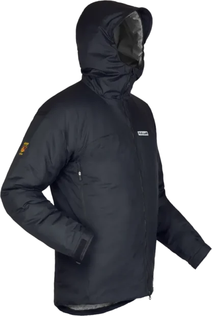 Overlayering jacket providing fast block insulation and functionality for high mountain activities in extreme or prolonged cold, wet conditions.